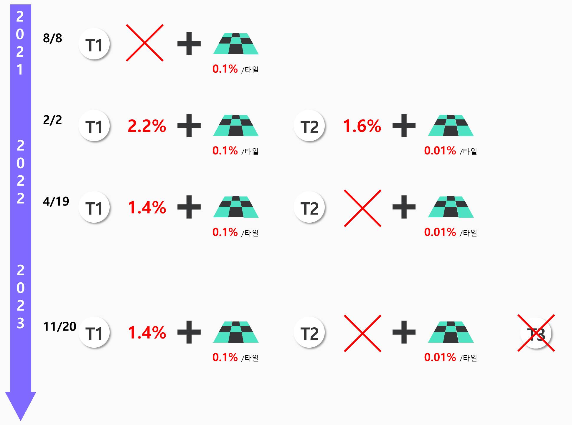 T2랜드에서는, 기본값이 사라지고 타일당 0.01 %p씩 더해주는 방식입니다. 예를 들어, 100 타일짜리 프로퍼티는 100 × 0.01 % = 1 % 발생률을 가지며, T1랜드에 비해 거의 1/10 이하의 발생률을 가집니다.
