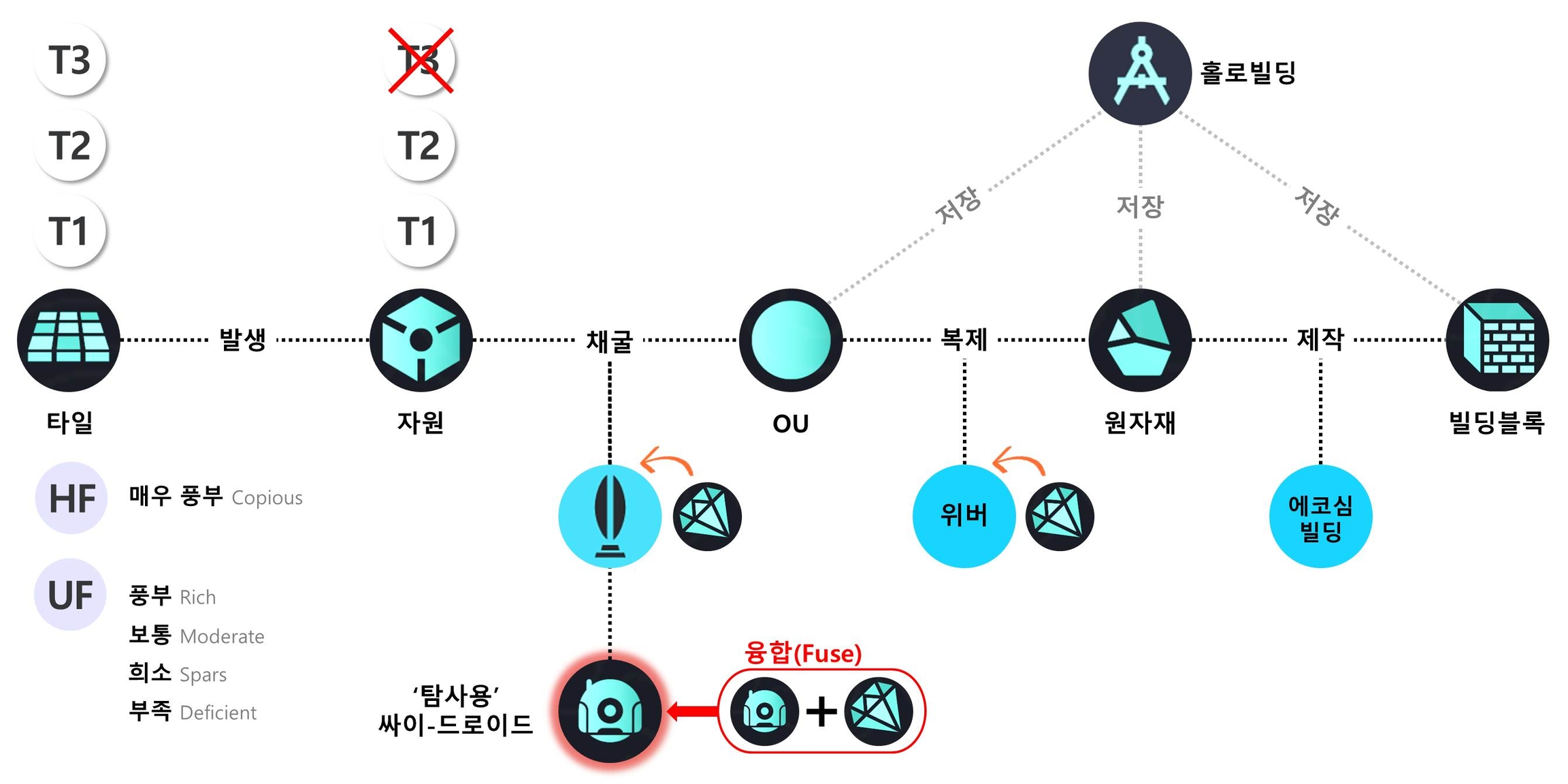 획득된 OU데이터는 위버를 통해 원자재로 바꿀 수 있으며, 이후 에코심빌딩과 기술을 통해 다양한 빌딩블록으로 가공할 수 있습니다.