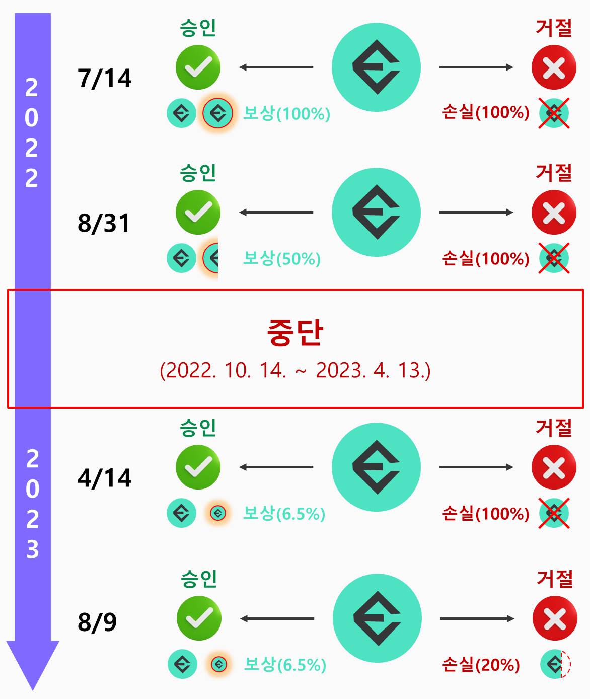 승인되면 스테이킹한 에센스를 돌려받고 추가로 100%를 얻게 되며, 거절되면 스테이킹한 에센스 전부(100%)를 잃는 방식이었습니다.
