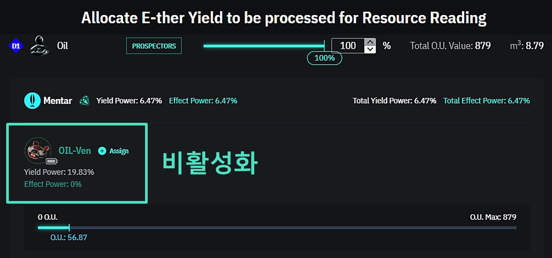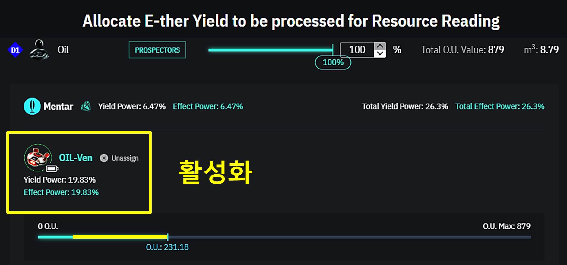 여기에 오일(Oil) 자원을 채굴할 수 있는 탐사용 싸이-드로이드(Gileumbo)를 배정(Assign)을 하면, 채굴능력이 1일 231.18 OU로 상승합니다.