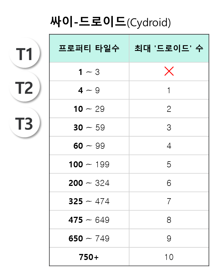 멘타르(씨드)와 연결되는 싸이-드로이드 개수의 한도는, 프로퍼티 티어와 관련이 없으며, 오로지 프로퍼티 크기(타일수)에만 연관되어 있습니다.