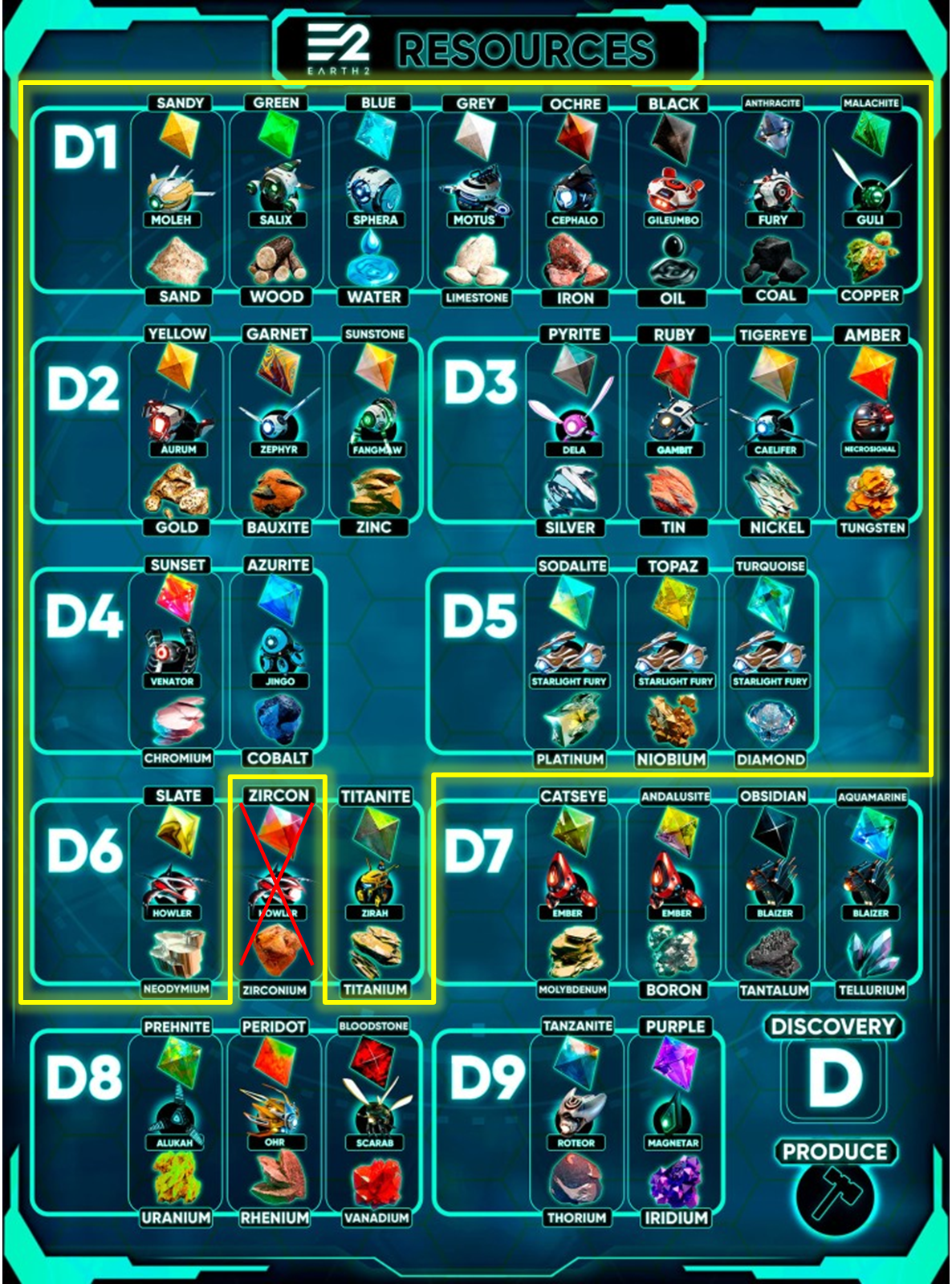 하지만, 멘타르가 탐지할 수 있는 자원 등급(D: Discovery Tier)에는 한계가 있습니다. 전체 D1\~D9중 D6까지만 탐지가 가능하며, 예외적으로 Zircon(D6)의 경우 탐지할 수 없다고 설정되어 있습니다.