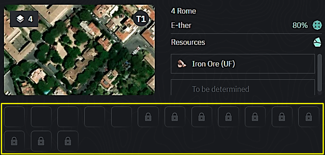또한, T1 750타일 프로퍼티(가장 높은 티어 + 가장 큰 규모)에 있는 멘타르라고 하더라도, 3개의 슬롯이 잠겨 있는 상태로 15개 전부가 오픈되지 않고, 12개 슬롯만 오픈됩니다. <mark style="color:blue;">향후, 잠겨 있는 3개의 슬롯이 풀리는 기능이 추가될 것으로 보입니다.</mark>