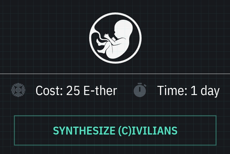 멘타르는 25에테르를 사용하여, 시빌리언을 생성(Synthesize)할 수 있습니다.<mark style="color:blue;">(생성에 사용된 25에테르는 소각됩니다.)</mark> 멘타르는 가지고 있는 레드에너지를 제공하여, 시빌리언을 충성도를 유지할 수 있습니다.