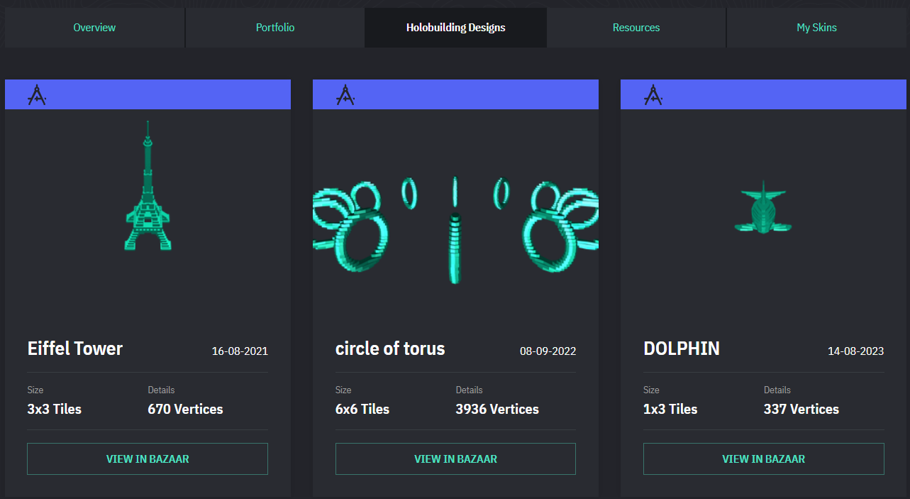 또한, 바자르에 오픈되면서 여러 창작물들이 실제로 많이 거래되었고, 홀로빌더(Holo-builder) 그룹이 생겨나 더욱 발전된 모습의 홀로빌딩이 제작되기 시작하였습니다.