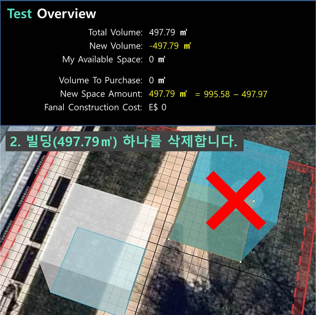 빌딩(497.79㎥) 하나를 삭제하면, New Space Amount가 497.79 ㎥가 되고, 이 값의 90 %인 448.01 ㎥가 홀로빌딩-가상지갑에 저장됩니다.