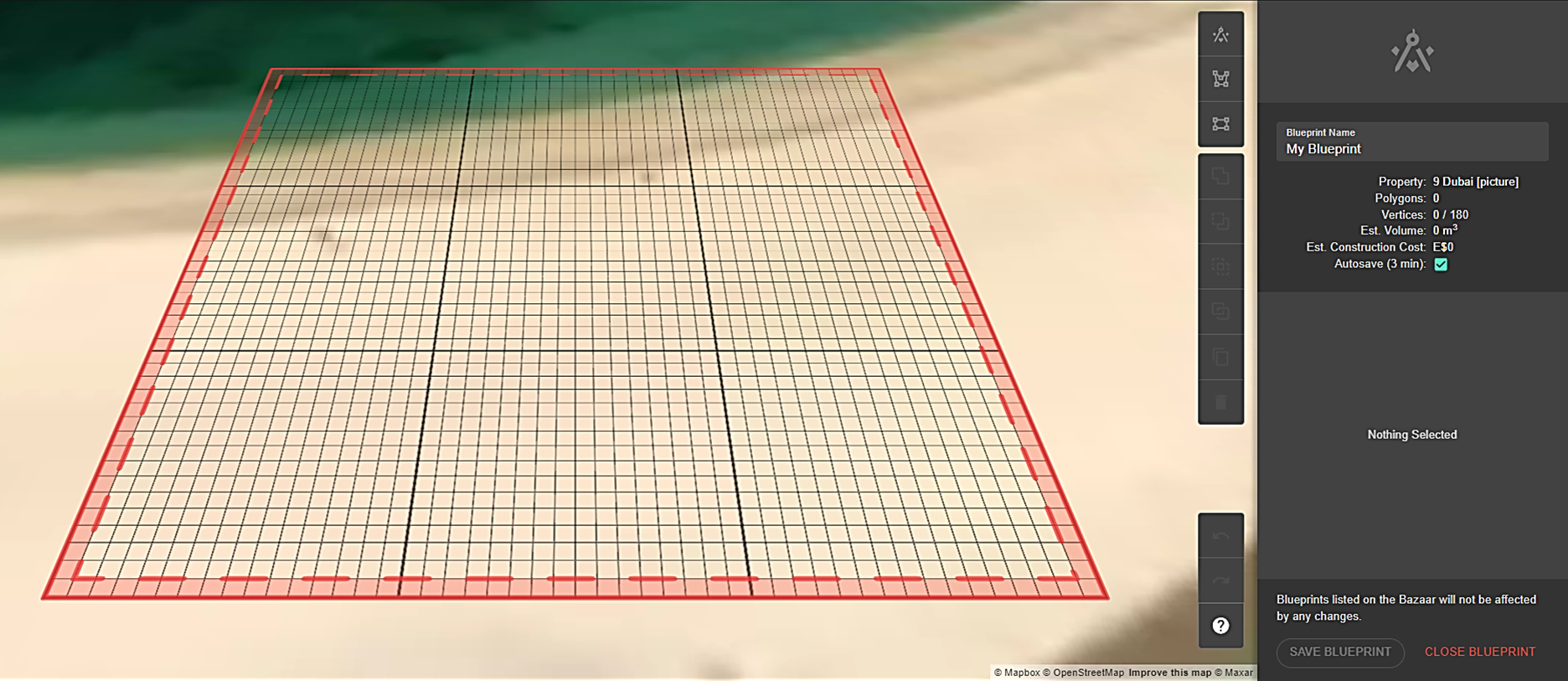구입한 프로퍼티에 설치할 블루프린트를 불러와서 배치하고 결제하면 끝나는 과정입니다. 결제 시, 크레딧(E$) 잔액이 충분해야 합니다.