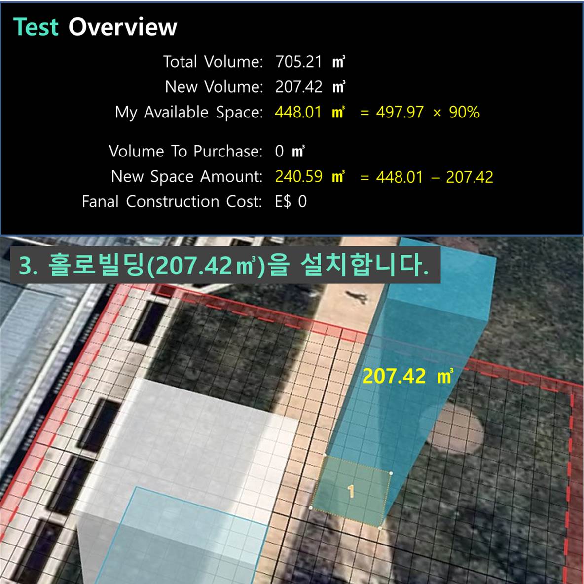 빌딩(207.42 ㎥) 하나를 설치하면, 홀로빌딩-가산지갑에는 사용하지 않은 240.59 ㎥가 그대로남게 됩니다.