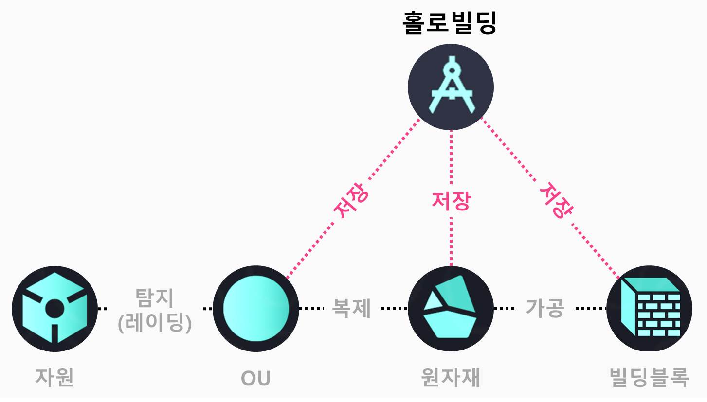 자원을 채굴하고 최종 원자재와 빌딩블록을 만들기 위해서 여러 프로세스를 거쳐야 합니다. 프로세스 단계마다 생산물을 임시 보관할 수 있는 저장공간이 필요한데, 홀로빌딩이 그 역할 맡게 됩니다.