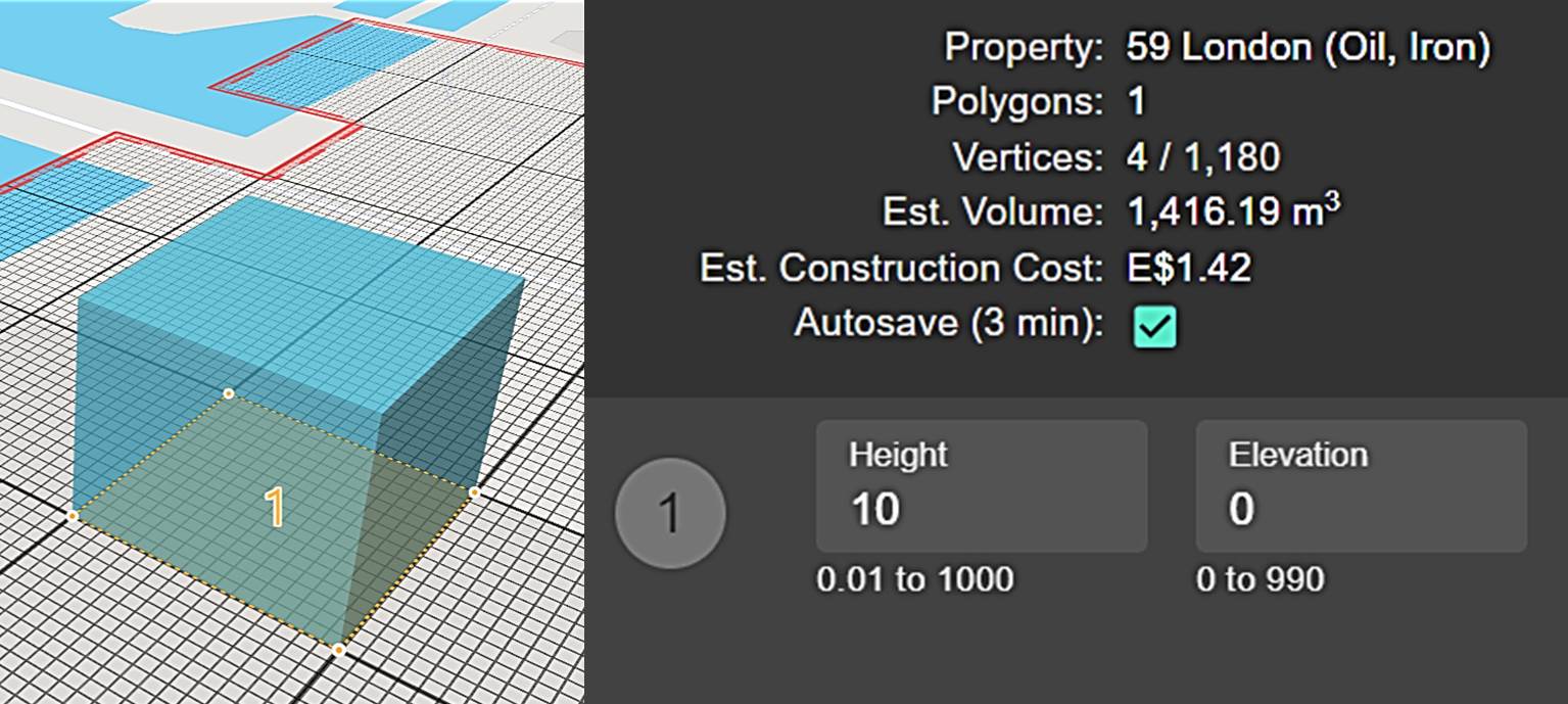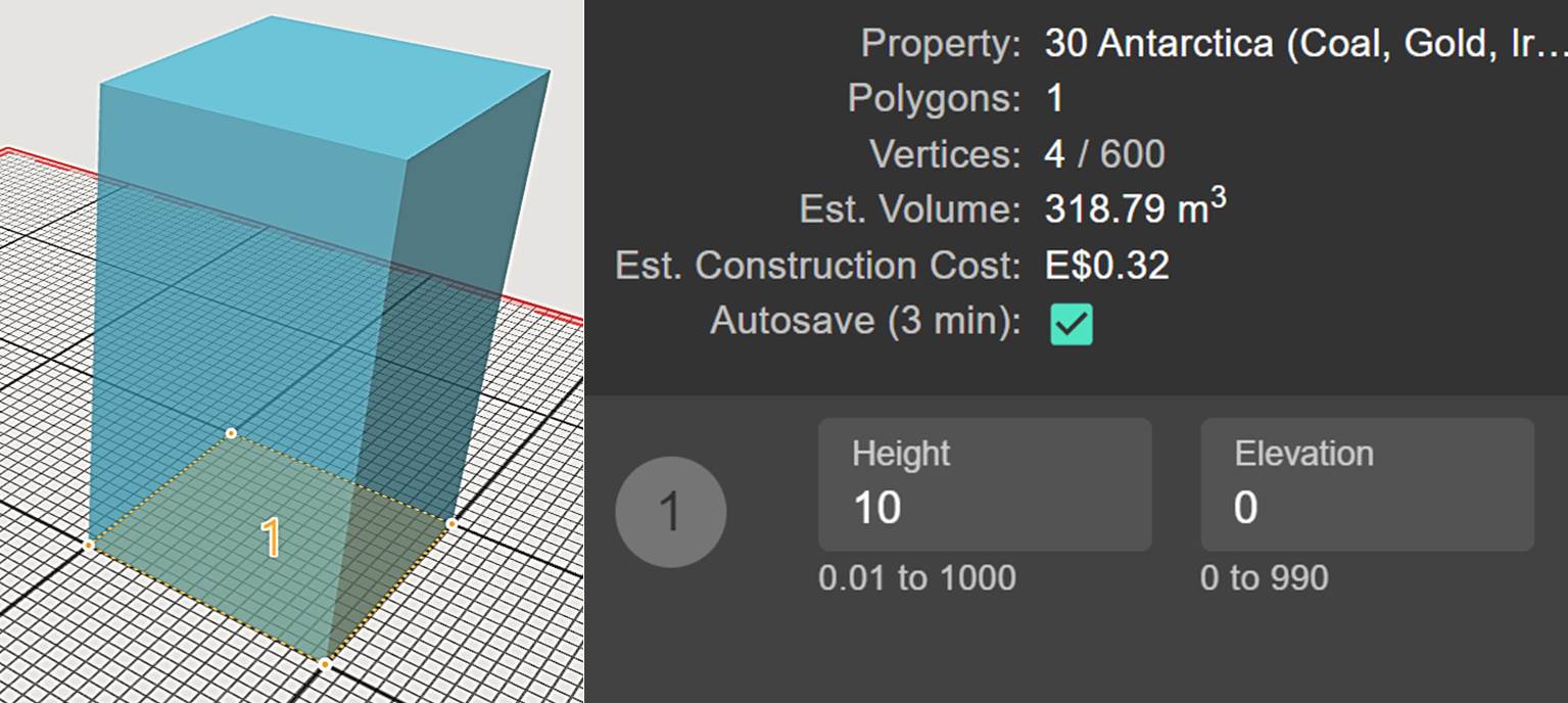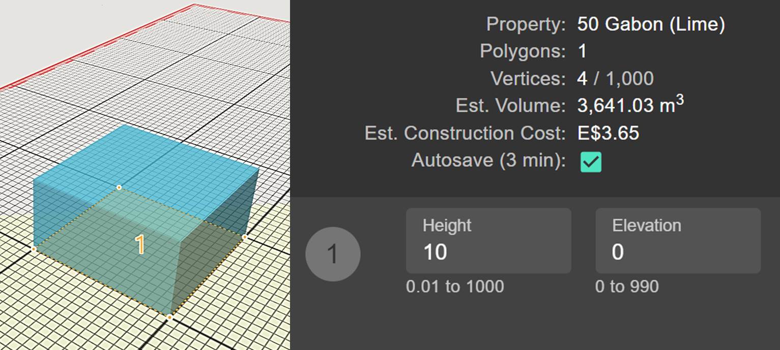 홀로빌딩 건설비용은 홀로빌딩 부피(㎥)를 1,000으로 나누고 소수점 3째자리 올림하여 산출됩니다. 올림이 되기 때문에, 990 ~ 999 ㎥ 부피는 동일하게 E$ 1.00입니다.