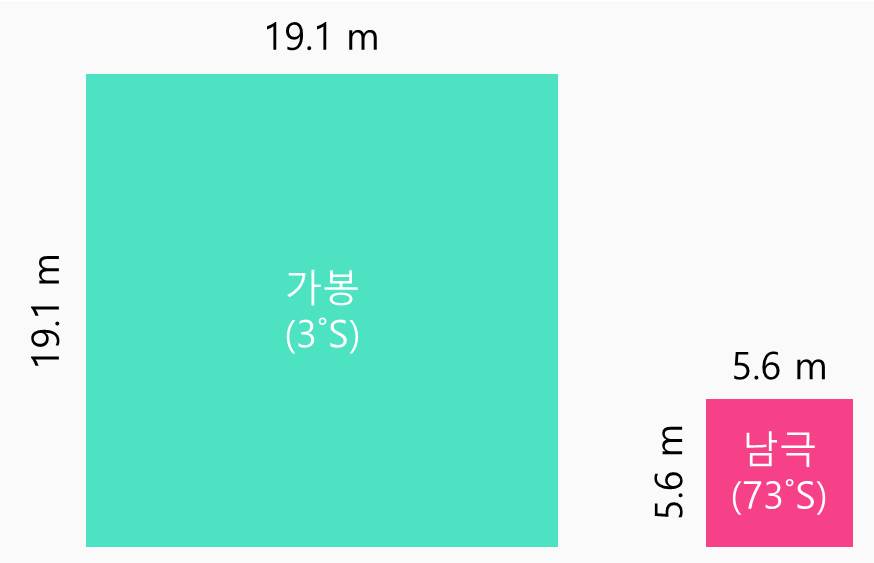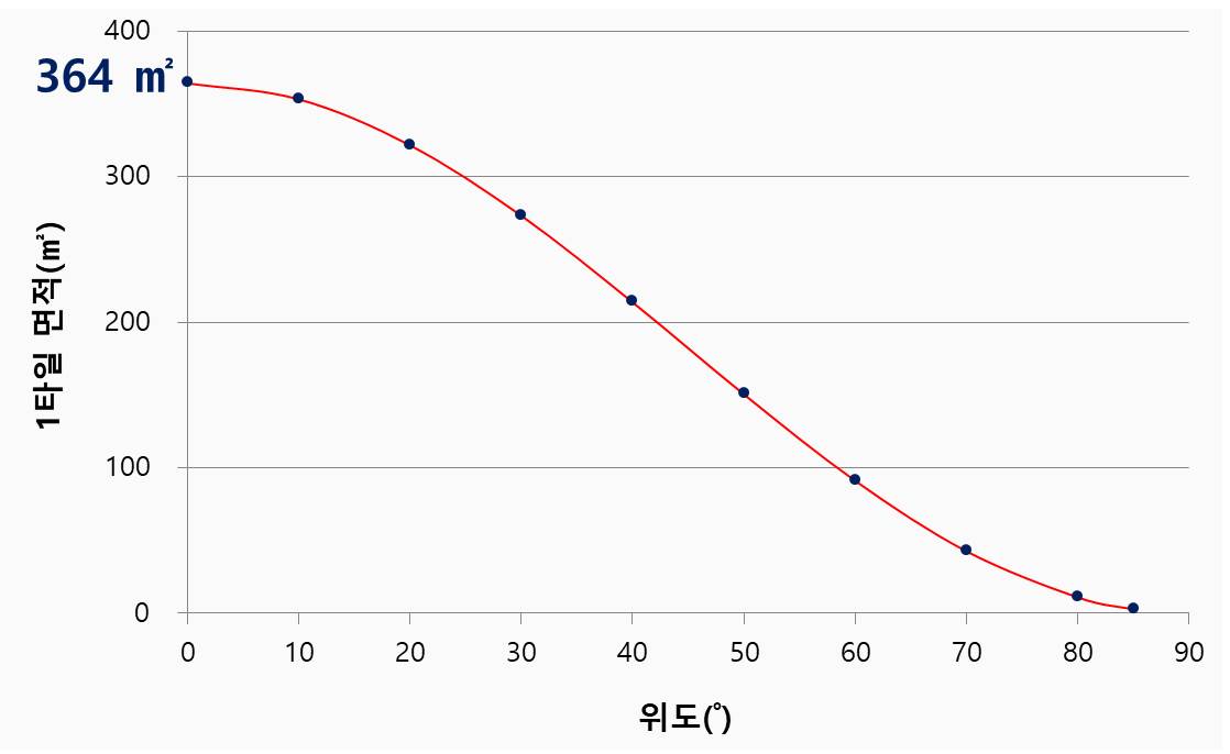 고위도로 갈수록 면적은 작아지고, 가봉(위도 3˚S)과 남극(위도 73˚S)의 1타일면적을 비교해 보면, 약 12배가 차이나는 것을 알 수 있습니다. (길이 비율로는 약 3.4배 차이가 납니다.)