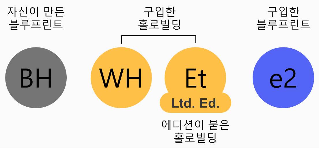 노란색 : 바자르를 통해 구입한 홀로빌딩입니다. 에디션이 붙은 홀로빌딩은 'Ltd. Ed.'가 붙습니다.