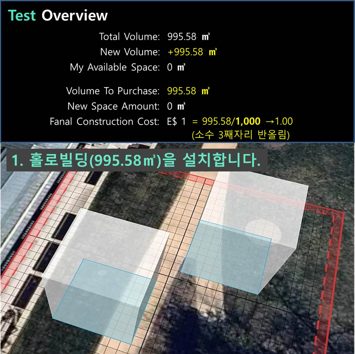 홀로빌딩(995.58㎥)을 설치하면, 건설비용(E$ 1)이 발생합니다.
