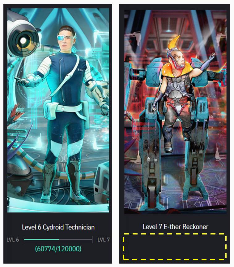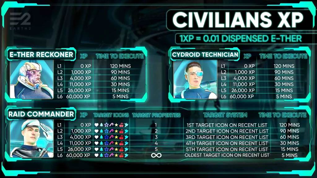 시빌리언은 레이딩으로 획득한 에테르를 디스펜싱하여 멘타르로 완전히 옮겨지면, 1에테르당 100 XP를 얻습니다. 획득한 경험치(XP)는 프로퍼티에 활성화된 시빌리언들에게 균등하게 배분됩니다.