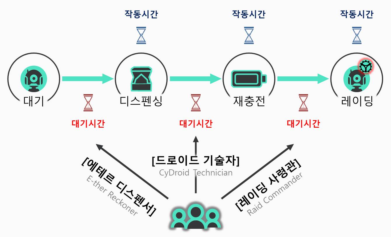 시빌리언 3개 직업(에테르 디스펜서, 드로이드 기술자, 레이딩 사령관)이 레이딩 과정에 어떻게 관여하는 지를 나타낸 모식도입니다.