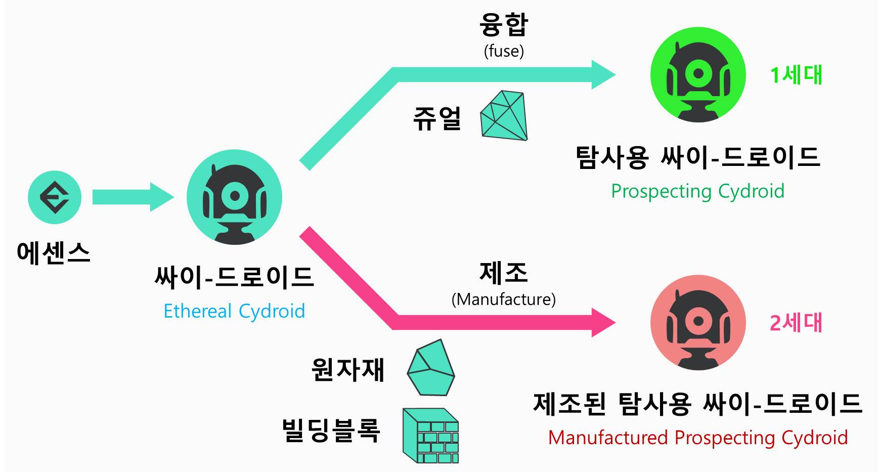 쥬얼을 융합(소각)하여 만드는 1세대와 달리, 2세대 싸이-드로이드는 원자재와 빌딩블록으로 제조되며, 자원 채굴/운반 등에 한정적 영역에서 사용될 것으로 보입니다. 🔗