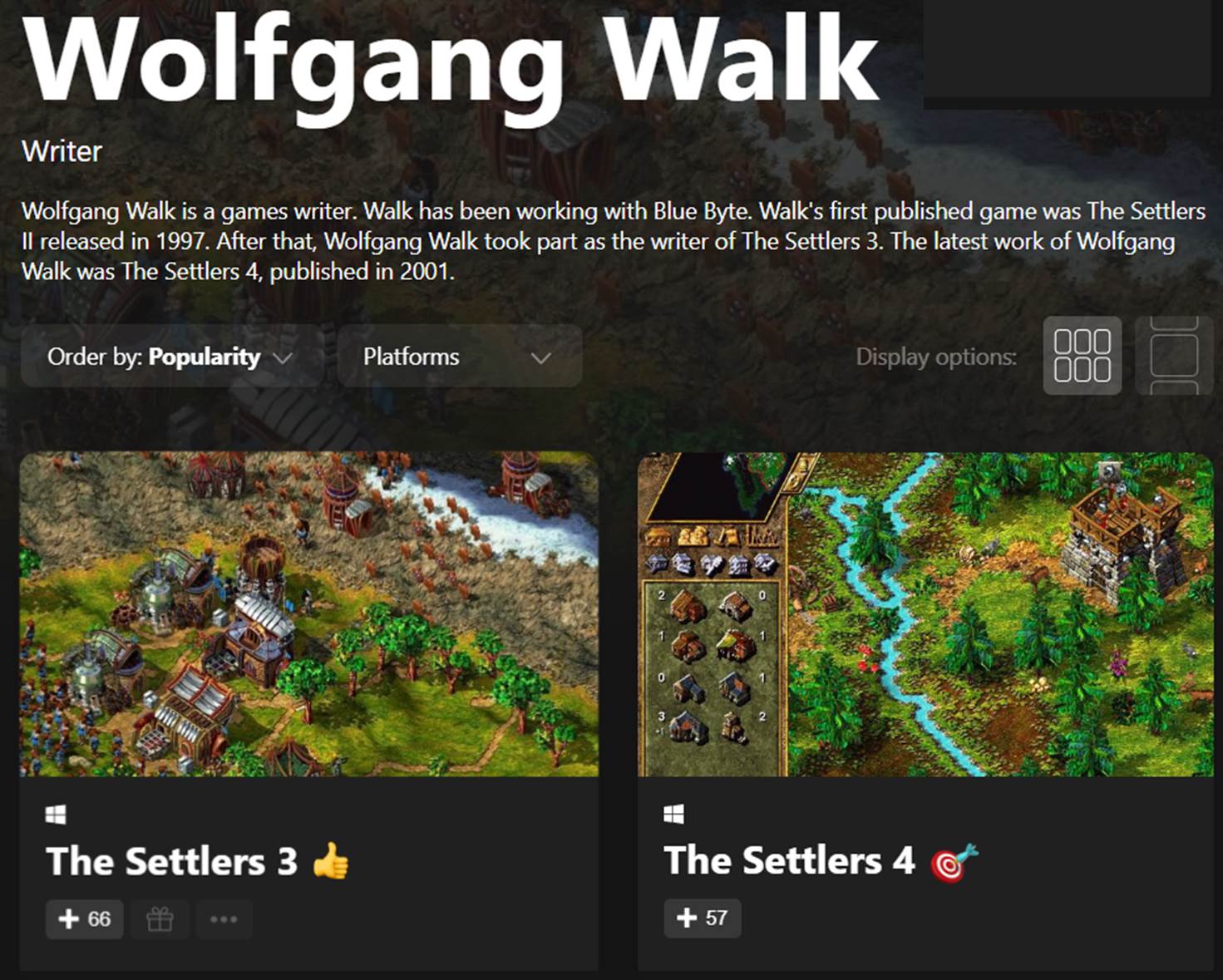 * The Settler 2, 3, 4 작가(writer) 참여. [🔗](https://rawg.io/creators/wolfgang-walk)