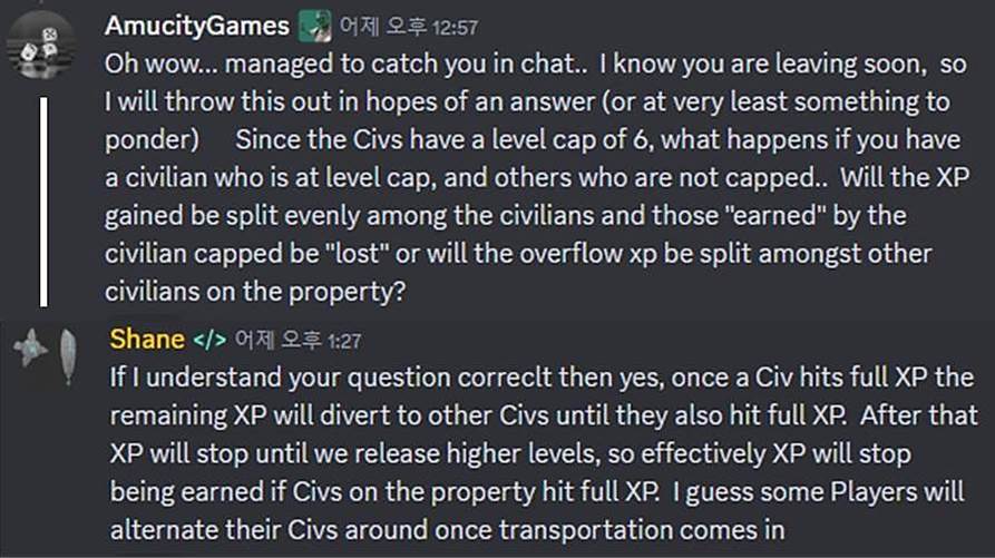 A. ...(중략)... 일단 시빌리언(Civ) XP가 풀로 차면, 남은 XP는 다른 시빌리언에게 분배될 것입니다. 그 이후, XP는 더 높은 레벨이 출시될 때까지 중지되며, 프로퍼티에 속한 시빌리언들이 모두 XP가 풀로 차면 사실상 XP가 중단됩니다. 교통편이 출시된다면, 일부 플레이어들은 자신의 시빌리언을 번갈아 이동시킬 것으로 생각됩니다.