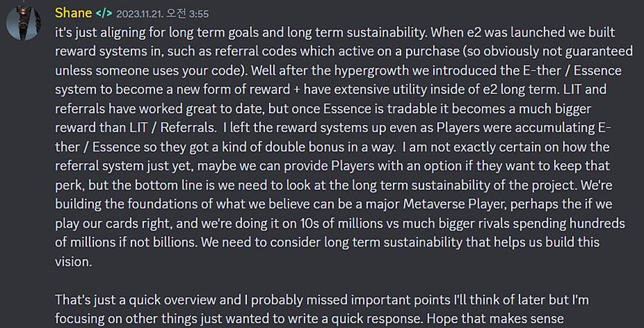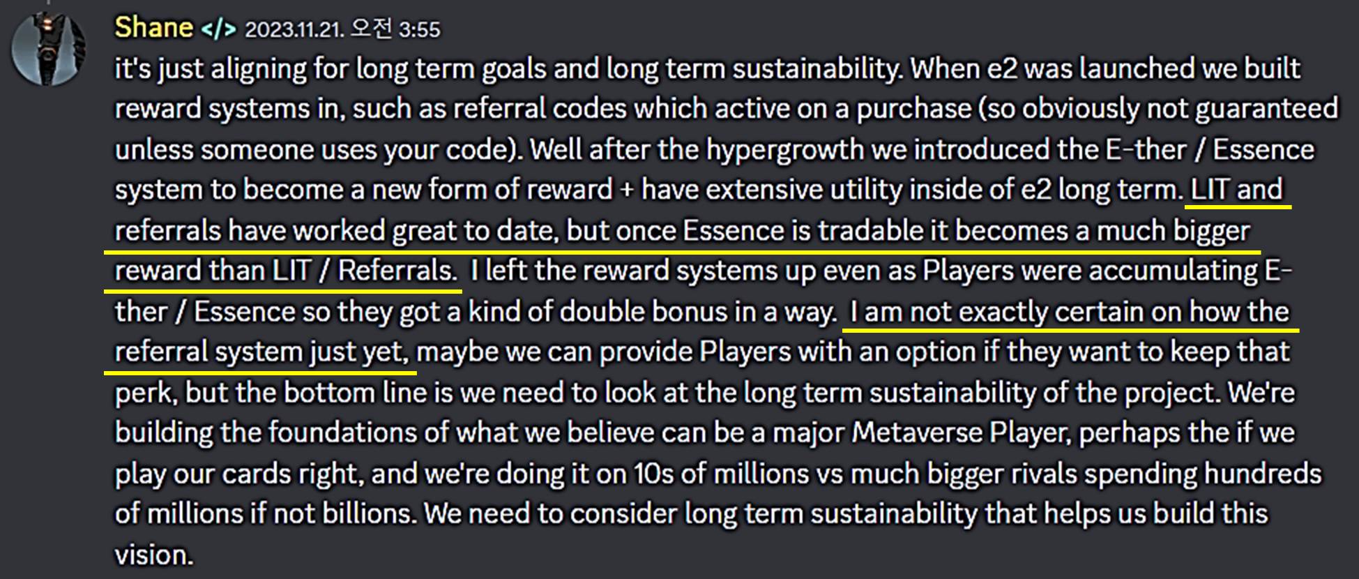 (전략..) 어스2가 출시되었을 때 우리는 구매 시 활성화되는 레퍼럴 코드와 같은 보상 시스템을 구축했습니다. (중략..) LIT와 레퍼럴코드는 현재까지 훌륭하게 작동했지만, 에센스 거래가 가능해지면, LIT/레퍼럴코드보다 훨씬 더 큰 보상이 될 것입니다. 플레이어는 에테르/에센스를 축적하면서 보상 시스템(LIT/레퍼럴코드)을 통해, 어떤 면에서는 2배의 보너스를 얻어 왔습니다. (..후략)