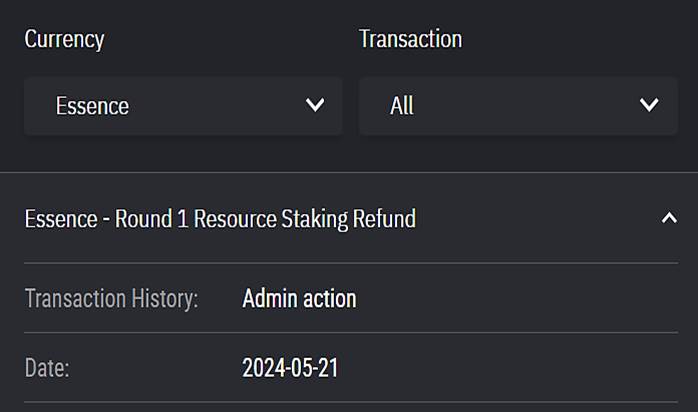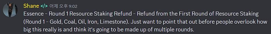 에센스 - 1라운드 자원 스테이킹 환불 - 자원 스테이킹 첫번째 시기(1라운드 - 금, 석탄, 오일, 철광석, 석회석)에 진행되었던 에센스 환불조치입니다. (..후략)