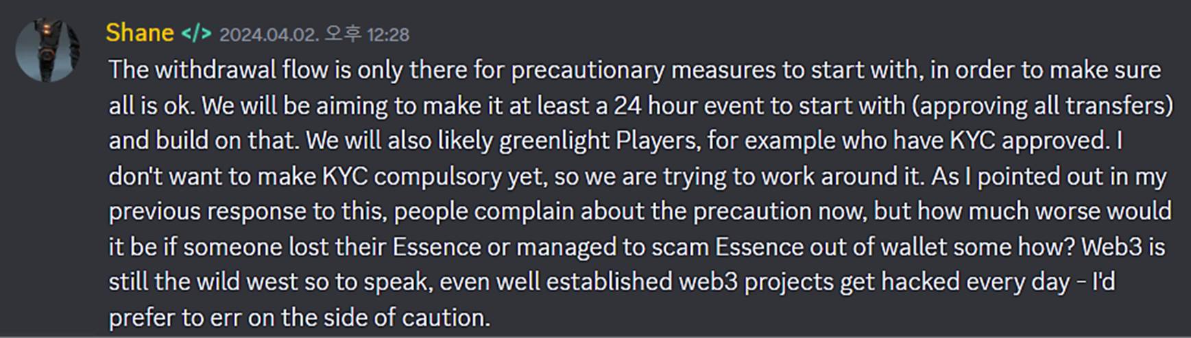 (에센스 토큰) 출금 절차는 모든 것이 정상인지 확인하기 위해 안전 조치를 (설정한) 것입니다. 우리는 최소한 24시간 동안 출금이 되는 것(모든 이체를 승인)을 목표로 할 것이며, 이를 바탕으로 (계속) 발전시켜 나갈 것입니다. (..후략)