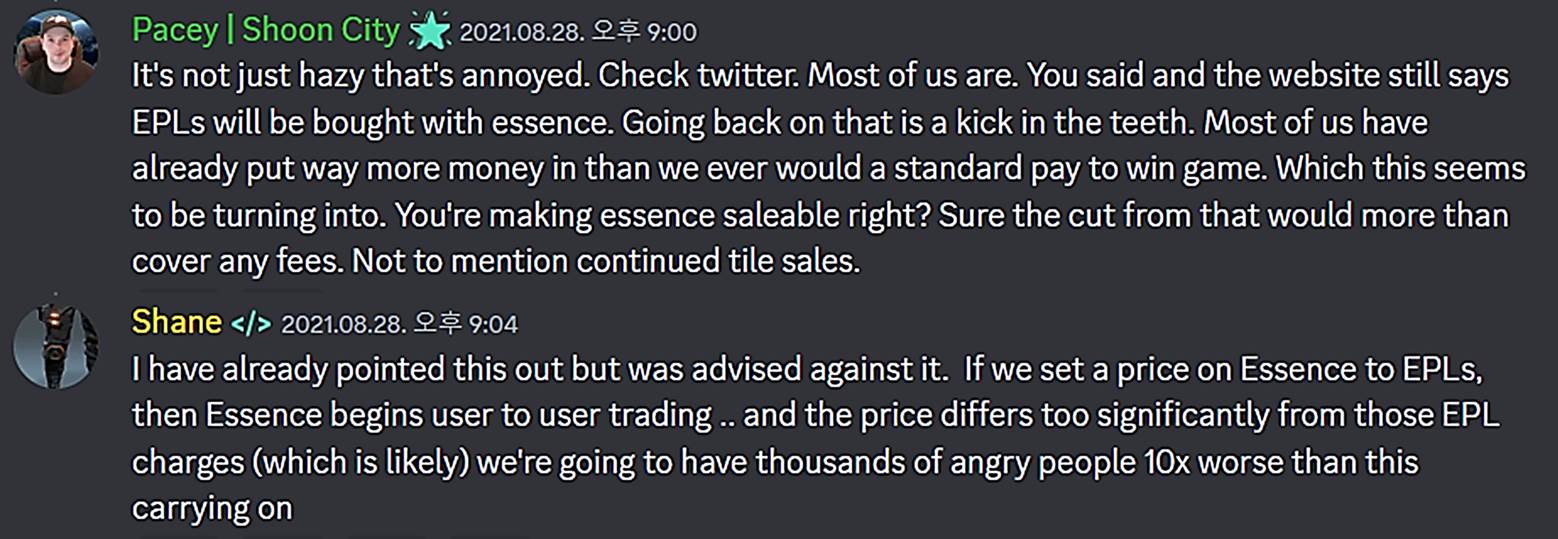 저는 이미 이러한 문제에 대해 지적해왔고, 이에 대한 조언을 받았습니다. 에센스 가격을 EPL에 설정하면 에센스는 사용자간 거래를 시작됩니다.. 그리고 가격은 EPL 요금과 너무나 달라질 것입니다(아마도). 우리는 수천 명의 사람들을 이러한 방식(크레딧으로 사는 방식)보다 10배는 더 화나게 만들 것으로 (보고) 있습니다.