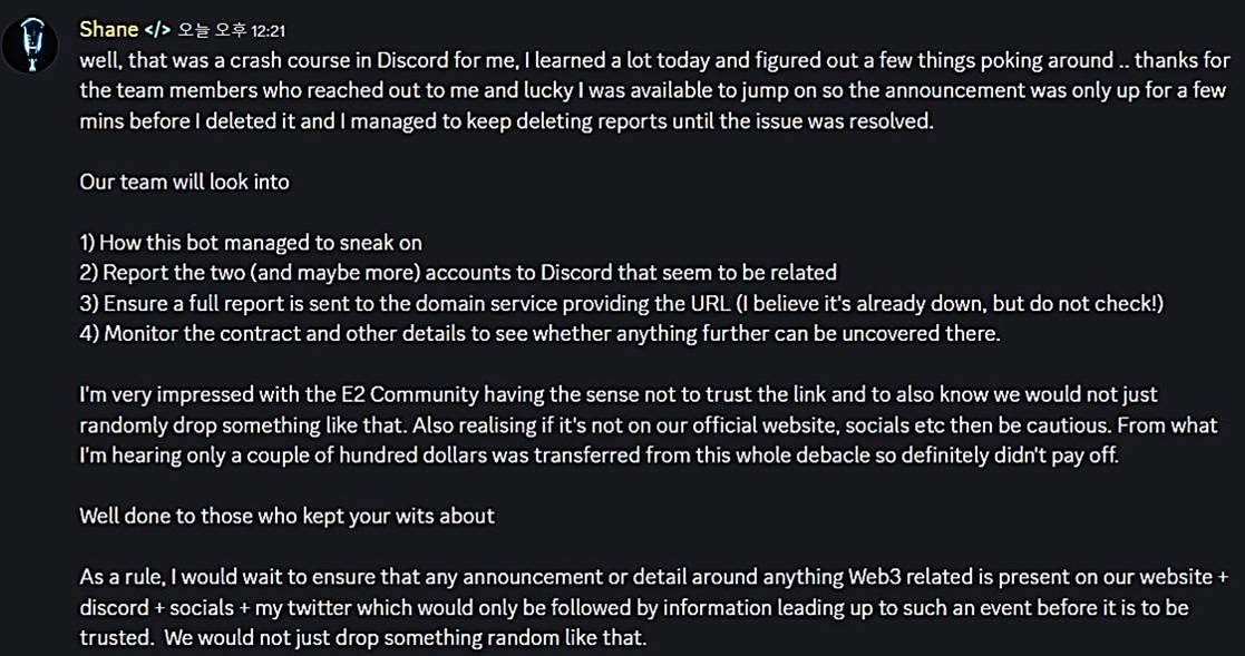 정확히 확인된 것은 아니지만, 운영진 디스코드 계정 중 하나가 해킹되어 발생된 것으로 보입니다.